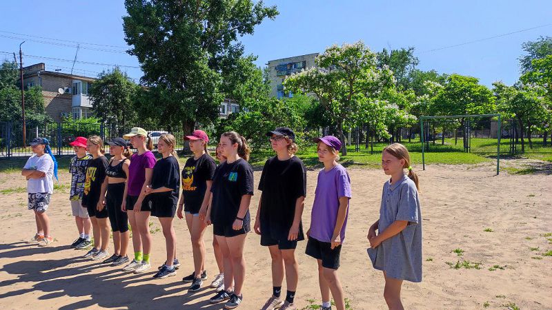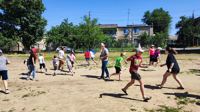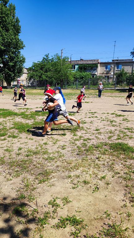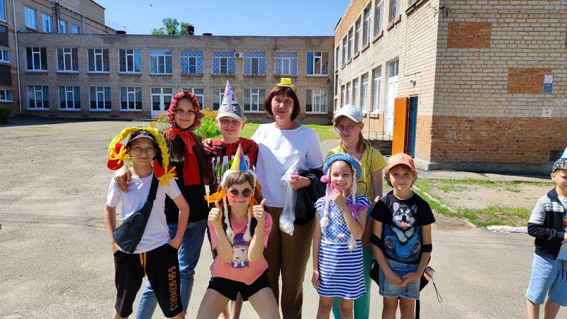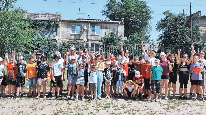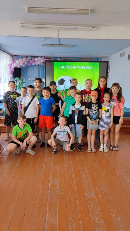 Им активно помогали ребята из отряда волейболистов, которые намеренно "перепутали" футбол и волейбол. На общей фотографии видны счастливые лица и весёлые улыбки детей.