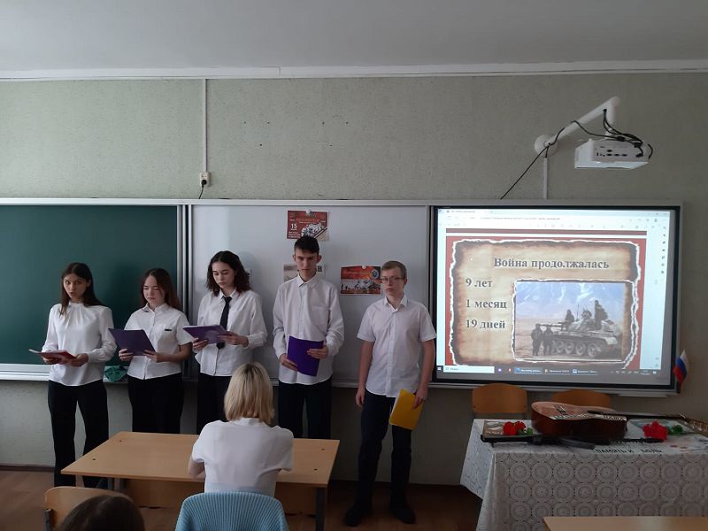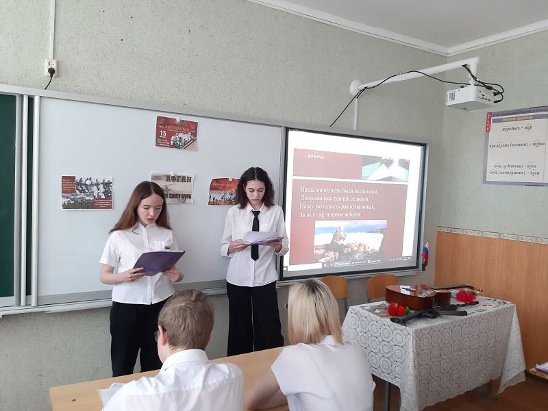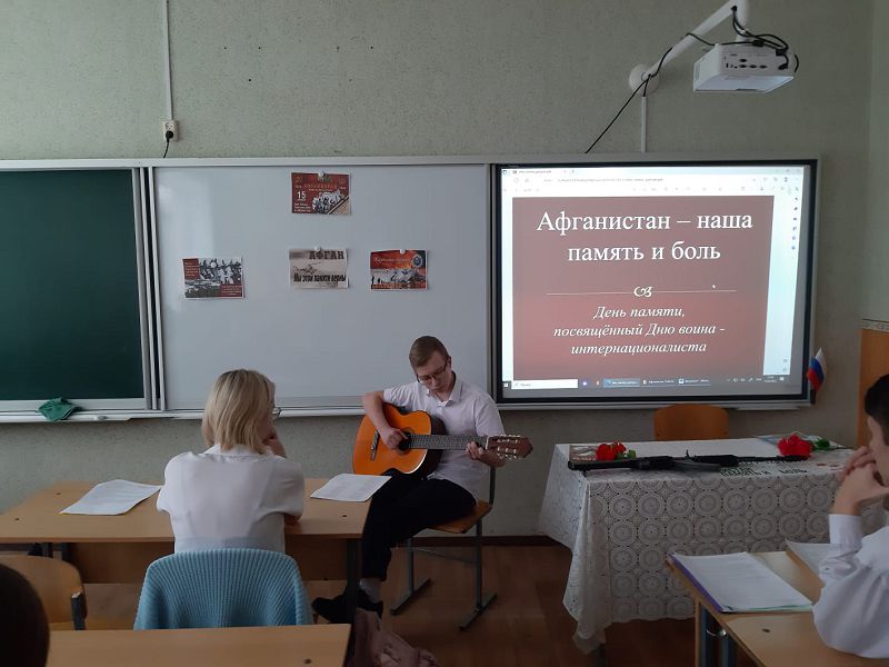 В исполнении Попович Тимофея под гитару прозвучала песня «Черный тюльпан», которую невозможно было слушать без содрогания. Учащиеся 9а класса посетили урок Мужества в ДК Чкалова «Эхо афганской войны».