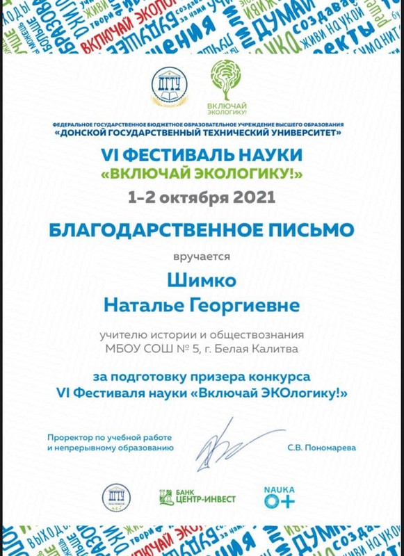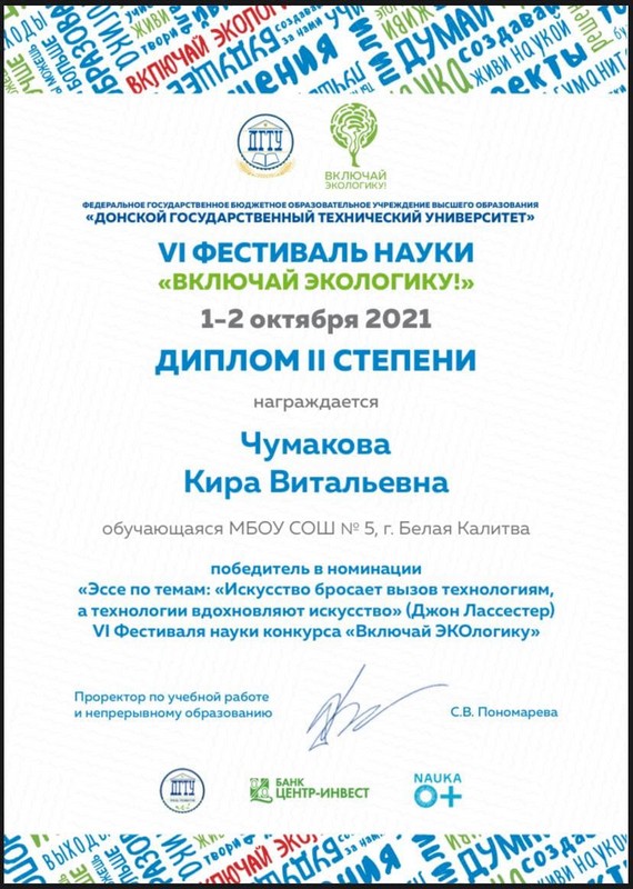 Чумакова Кира, ученица 11 класса, награждена дипломом II степени VI фестиваля науки «ВКЛЮЧАЙ ЭКОлогику» в номинации «Эссе по теме: Искусство бросает вызов технологиям, а технологии вдохновляют искусство», проходившего в рамках Всероссийского фестиваля науки на базе ДГТУ. Спасибо Шимко Н.Г., учителю истории и обществознания нашей школы, за подготовку призера конкурса.