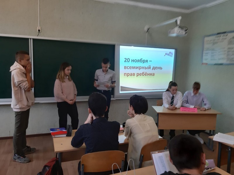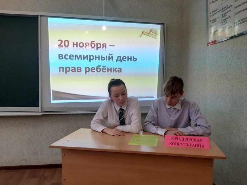 В целях ознакомления учащихся с основными правами несовершеннолетних в 8б классе прошел классный час: «Всероссийский День правовой помощи детям», на котором были рассмотрены вопросы повышения уровня правовой культуры школьников, развития правовой грамотности и правосознания обучающихся, а так же профилактика правонарушений учащихся «группы риска». С учащимися «группы риска» была проведена ролевая игра «Юридическая консультация». Ребята инсценировали правонарушения, а юристы давали правовую оценку.