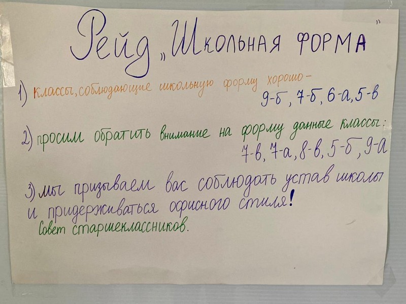 Школа — это образовательное учреждение, которое требует соблюдения норм и правил обучающимися. С целью выполнения требований к внешнему виду согласно Уставу школы и Положения о школьной форме, комиссия в составе Совета старшеклассников проводили рейд по проверке состояния внешнего вида обучающихся 5-11 классов.