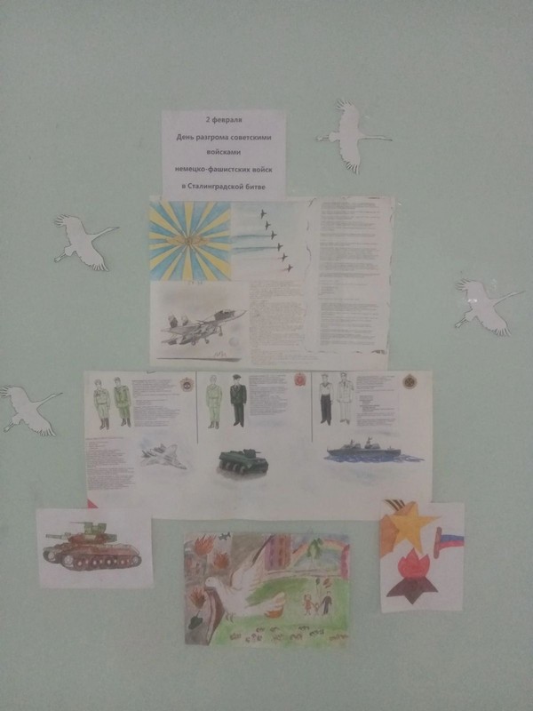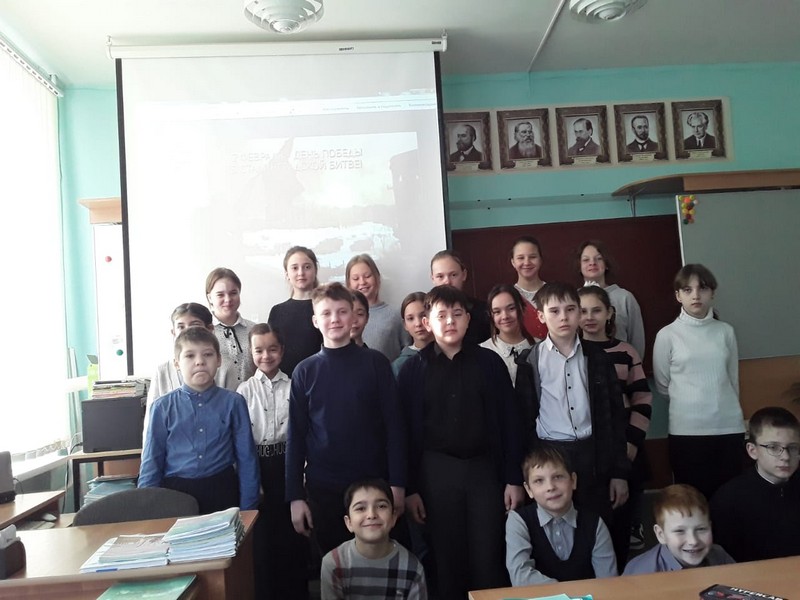 В этот день в школе прошли военно-патриотический час «Ты выстоял, великий Сталинград!», урок Мужества «Сталинград! Город, совершивший великий подвиг» Учителя истории рассказали ребятам о битве за Сталинград, о героизме и мужестве советских солдат, о командном составе, о подвигах рядовых солдат, медсестёр и даже детей. Ребята познакомились с историческими памятниками той великой битвы: Мамаевым курганом, домом Павлова, посмотрели хронику Сталинградской битвы.