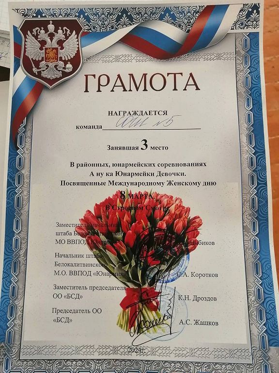 Команда Юнармеек заняли 3 место в строевом смотре в районных юнармейских соревнованиях, посвященных Международному Женскому дню!