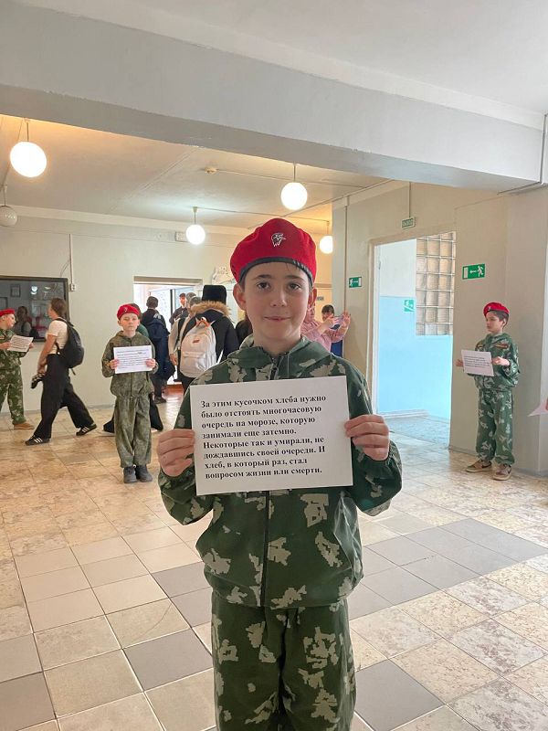 На переменах ученики рассредоточились по школе с информоционными листами, где были написаны краткие факты о блокадном Ленинграде.
