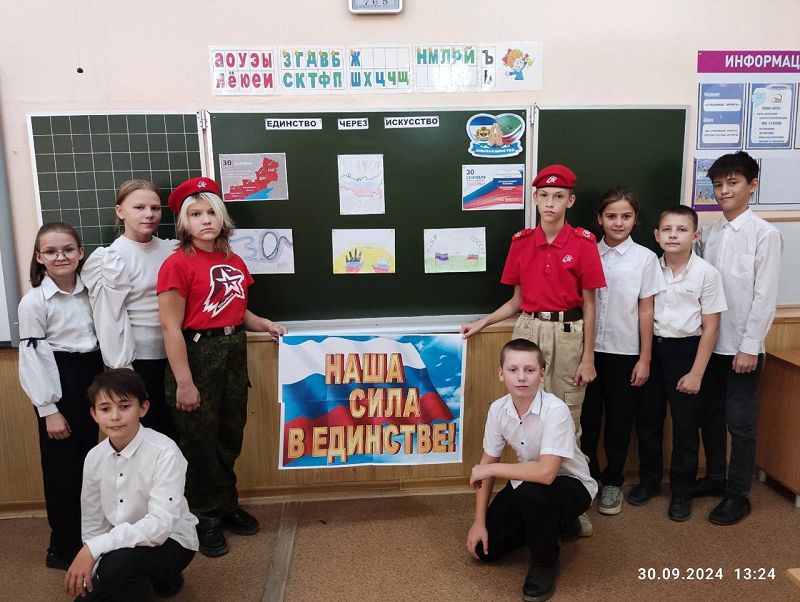 Юнармейцы МБОУ СОШ 5 в день памятной даты приняли участие в выставке рисунков "Единство через искусство".