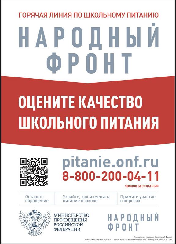 Министерство образования Ростовской области в соответствии с письмом Минпросвещения России от 25.11.2025 № ИШ-2337/04 сообщает, что Общероссийским общественным движением «Народный фронт «За Россию» (далее – Народный Фронт) совместно с Минпросвещения России и АНО «Институт отраслевого питания» запущена горячая линия «Школьный завтрак» с целью контроля качества школьного питания.
