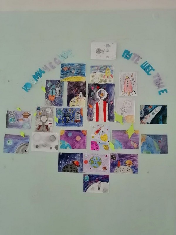 Григорьевна А. М., учитель изобразительное искусства, организовала выставку рисунков "Космическое путешествие", посвящённую Дню космонавтики.