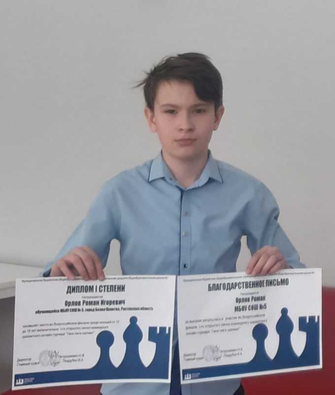 I место во Всероссийском финале среди юношей от 12 до 18 лет включительно I-го открытого лично-командного шахматного онлайн-турнира “Твоя лига шахмат” занял Орлов Роман обучающийся 6 в класса.