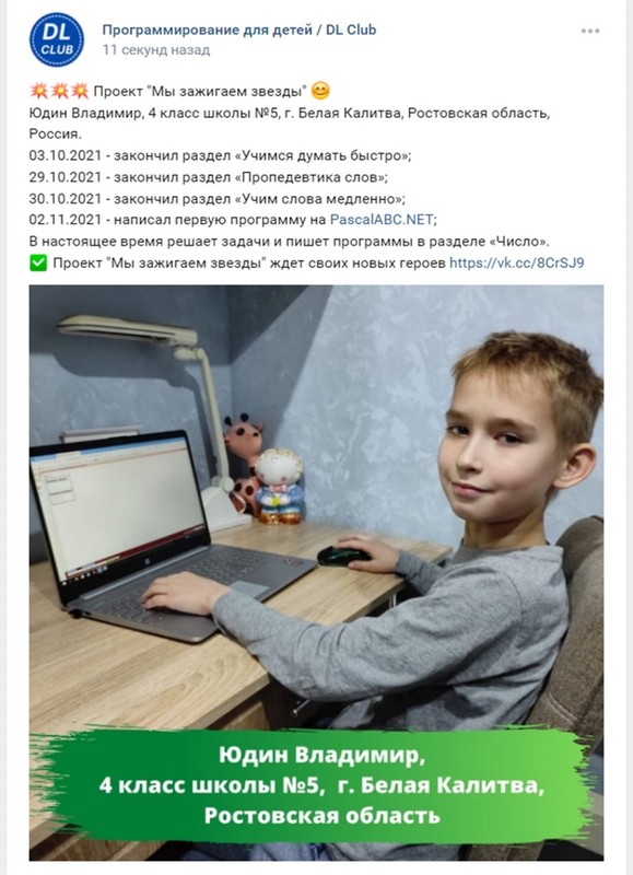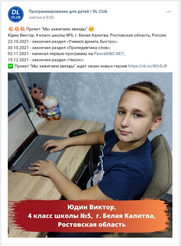 В рамках центра олимпиадного программирования DL CLUB, учащиеся 4 класса Юдины Виктор и Владимир, были награждены похвальными листами - За успешное выступление на IX открытой олимпиаде по программированию, для учащихся начальной школы.