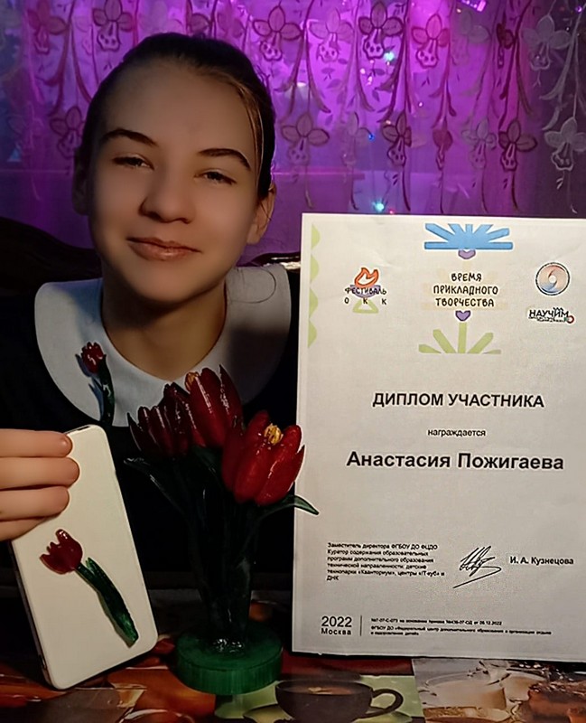 В рамках Всероссийского фестиваля общекультурных компетенций прошло тематическое мероприятие «Время прикладного творчества». В качестве конкурсного задания мероприятия предлагалось разработать макет сувенирной продукции своего региона, который расскажет о том, какие мастера и народные промыслы есть в нашей большой стране. На базе центра Точка Роста ученица 8 класса Пожигаева Анастасия приняла участие в данном конкурсе и разработала свой проект на 3 D принтере.