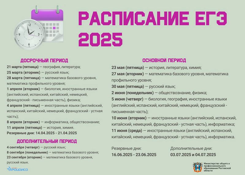 Досрочный период ЕГЭ пройдет с 21 марта по 21 апреля, основной период – с 23 мая по 23 июня, дополнительный период – с 4 по 23 сентября. В каждом периоде предусмотрены резервные дни.