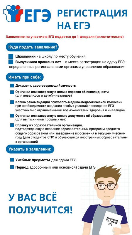 Для участия в ЕГЭ (досрочный, основной этапы) выпускники подают заявление до 1 февраля.