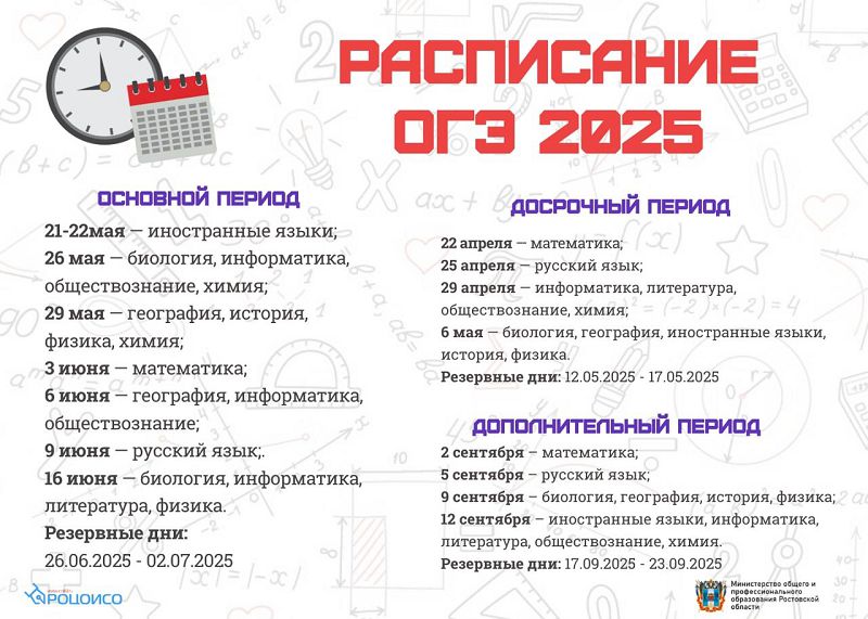 Досрочный период ОГЭ пройдет с 22 апреля по 17 мая, основной период – с 21 мая по 2 июля, дополнительныйпериод – с 2 по 23 сентября. В каждом периоде предусмотрены резервные дни.